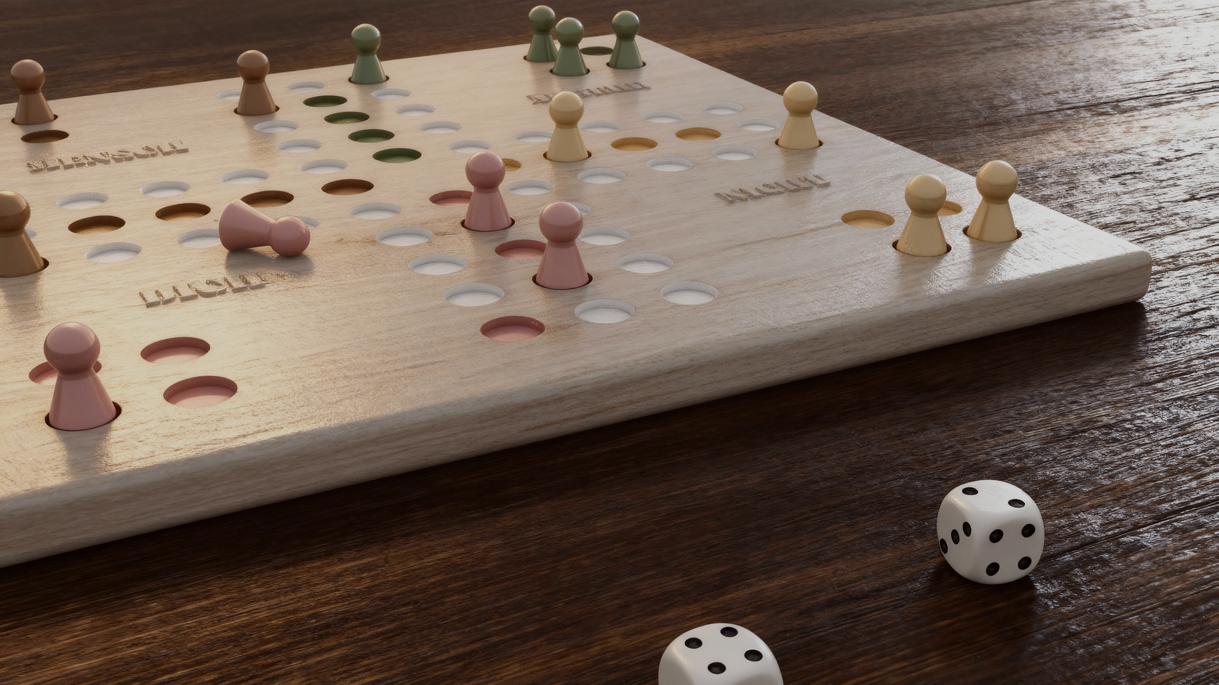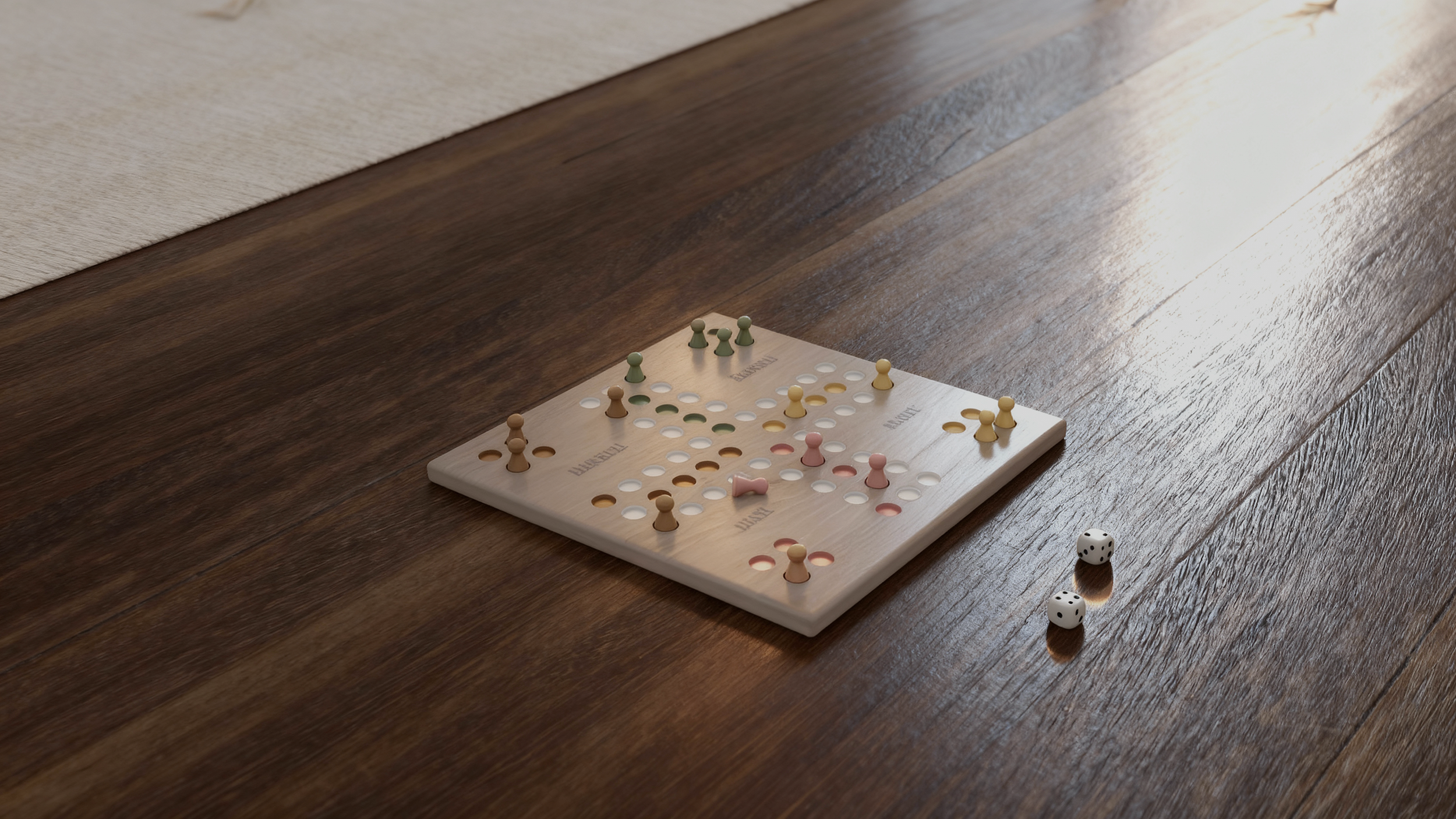 Das Spielbrett wurde als massives Holzobjekt konzipiert, mit präzise gefrästen Spielfeldern und Schriftzügen. Die Spielfiguren sind bewusst als schwere, wertige Objekte gedacht, um Haptik und Materialqualität auch visuell erfahrbar zu machen.