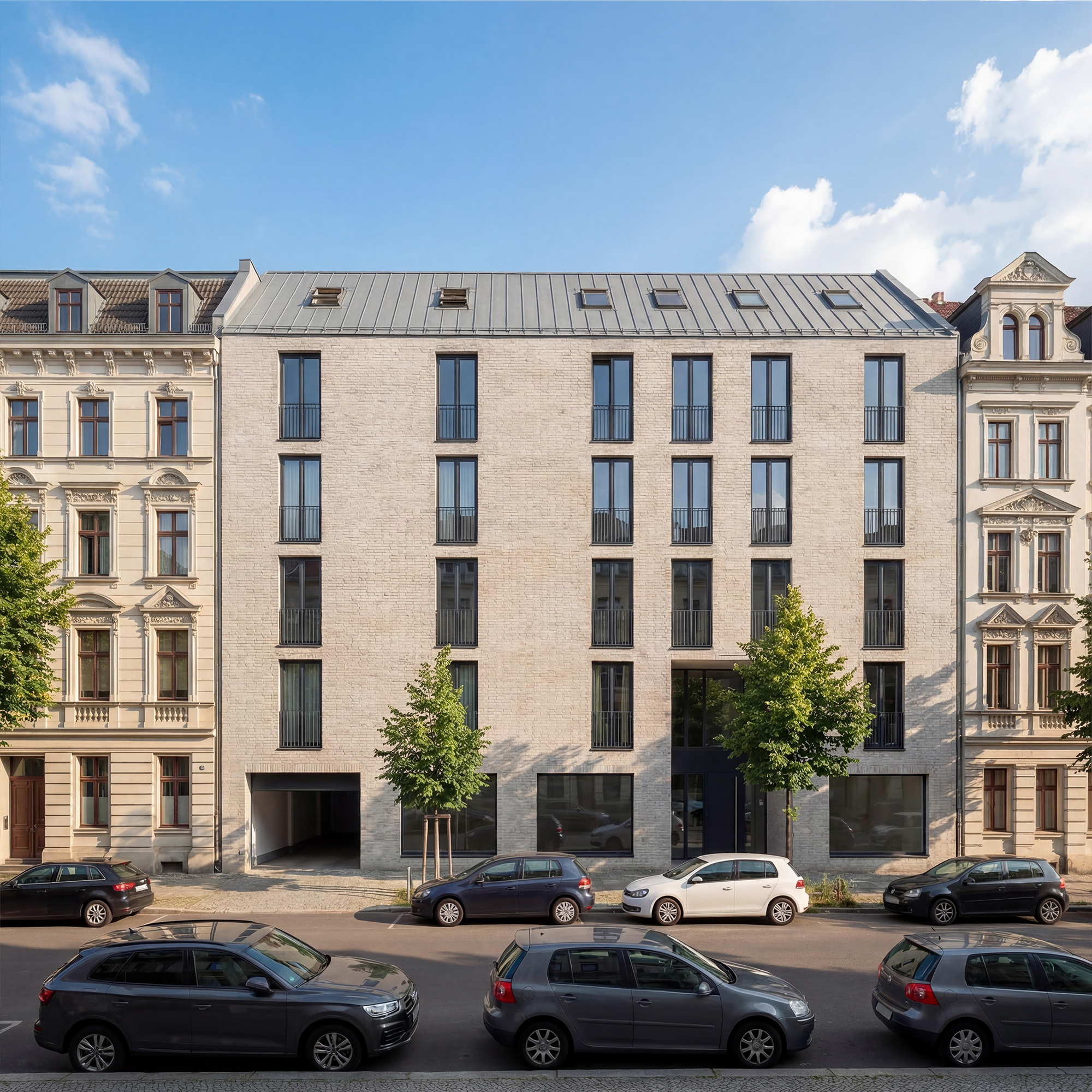 Im Fokus steht eine aktive Erdgeschosszone als Schnittstelle zum Stadtraum: Café und Gemeinschaftsbereiche schaffen Aufenthaltsqualität und Belebung, ergänzt durch Wohnen und ein Atelier. Die Nebenfunktionen sind im Untergeschoss organisiert (u. a. Tiefgarage, Fahrradkeller, Waschraum, Technik) und entlasten den Straßenraum, während darüber der Wohnanteil in den Regelgeschossen effizient fortgeführt wird.