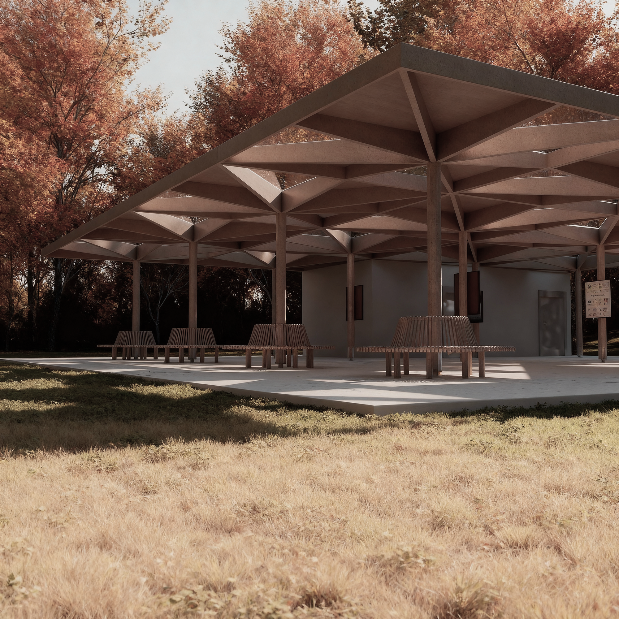 Durch klare Blickachsen, reduzierte Materialität und eine offene Struktur wird der Pavillon als niedrigschwelliger Treffpunkt inszeniert – geeignet für Parks, Campusareale oder städtische Grünräume. Die Visualisierung unterstützt die frühzeitige Vermittlung von Raumwirkung, Nutzungsszenarien und Atmosphäre gegenüber Auftraggebern, Kommunen und der Öffentlichkeit.